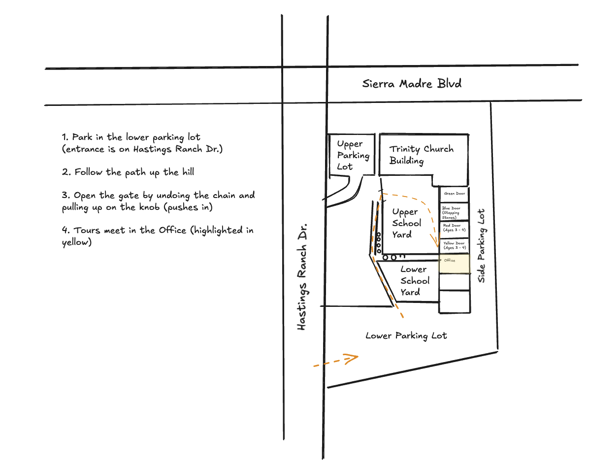 A: Please meet us at the front of the Hastings Ranch Nursery School office, which is located in “Upper School” and is the 2nd to last door on the right.